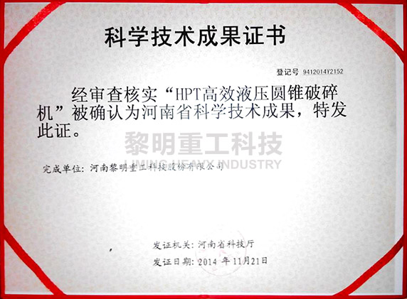 • HPT高效液壓圓錐破碎機(jī)獲河南省科學(xué)技術(shù)成果 >>查看證書