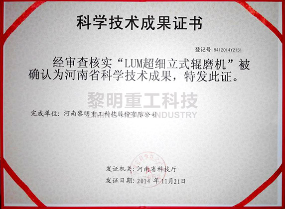 • LUM超細(xì)立式輥磨機(jī)獲河南省科學(xué)技術(shù)成果 >>查看證書