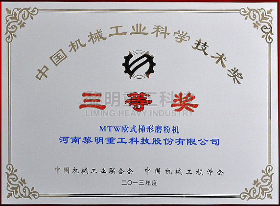 • MTW歐版梯形磨粉機(jī)中國(guó)機(jī)械工業(yè)科學(xué)技術(shù)獎(jiǎng) >>查看證書
