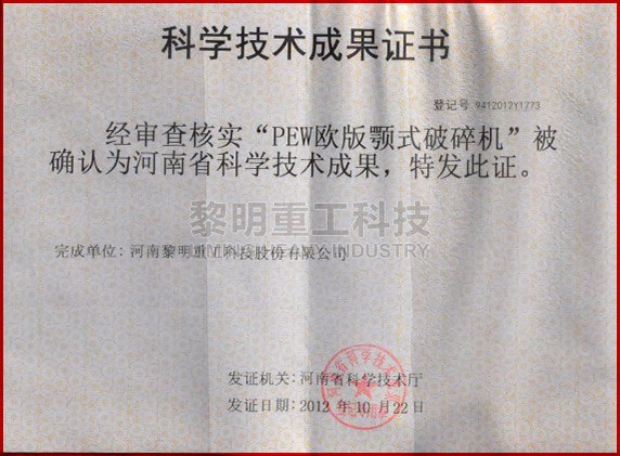 • PEW歐版顎式破碎機(jī)獲河南省科學(xué)技術(shù)成果 >>查看證書
