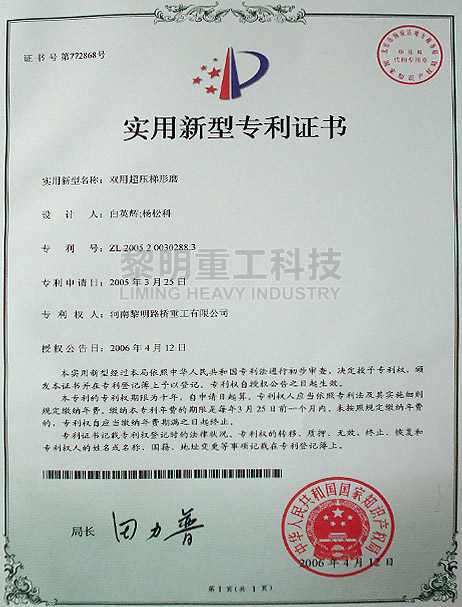 • 雙用超壓梯形磨粉機(jī)專利號(hào):ZL 200520030288.3 >>查看證書