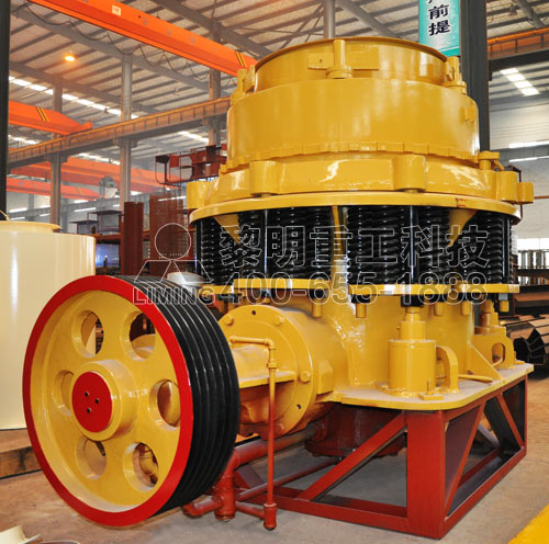 電動機通過三角帶、大帶輪、傳動軸、小錐齒輪、大錐齒輪帶動偏心套旋轉,破碎圓錐軸心線在偏心軸套的迫動下做旋轉擺動,使得破碎壁表面時而靠近又時而離開軋臼壁的表面,從而使物料在定錐與動錐組成的環形破碎腔內不斷地受到沖擊、擠壓和彎曲而破碎。經過多次擠壓、沖擊和彎曲后,物料破碎至要求粒度,經下部排出。