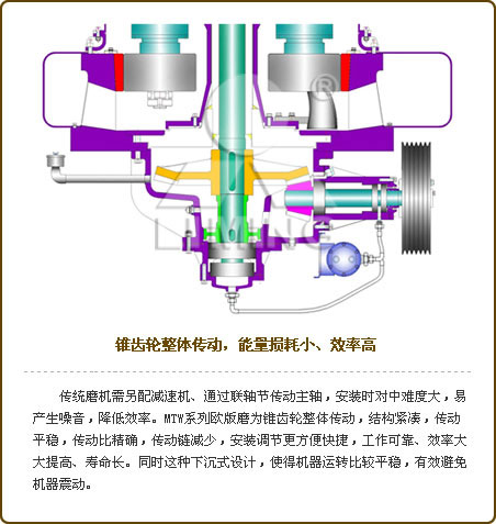 MTW系列歐版磨粉機工作原理整機為立式結構,占地面積小,成套性強,而且主機傳動裝置采用密閉齒輪箱,傳動平穩。磨機的重要部件均采用品質良好鋼材制造,因此整機耐用可靠。磨粉機電器系統采用集中控制,選型標準合理,自動化程度高,振動給料機體積小重量輕,易于調節并省電。