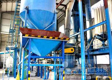 方解石超壓梯形磨粉機:選粉機通過調速電機帶動轉盤上的葉片旋轉,形成對方解石粉的分級作用。合格的方解石粉通過葉片隨氣流吸入大旋風收集器內,氣流與粉子被分離后,粉子被收集。不合要求的粉子被葉片拋向外壁與氣流脫離,粗粉子因自身重力的作用落入磨室進行重磨。當帶粉氣流進入收集器時,是高速旋轉狀態,待氣流與方解石粉分離后,氣流體壁收縮向中心移動至錐底時形成一個旋轉向上的氣流圓柱,這時粉子掉落被收集。收集器下端裝有鎖粉器,其作用是將外界正壓氣體與收集器負壓氣體隔離開。