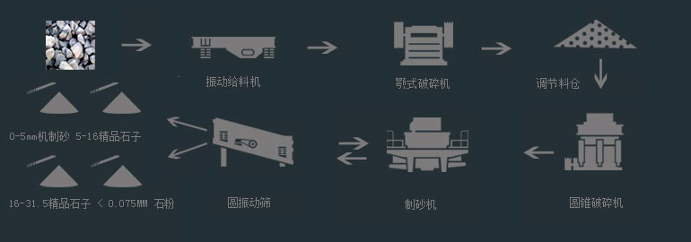 大塊石料經料倉由振動給料機均勻地送進顎式破碎機中粗碎,產出的粗料由皮帶輸送機輸送至液壓圓錐式破碎機細碎,細碎后的石料進入制砂機整形,由振動篩篩分出不同規格的砂石料。
