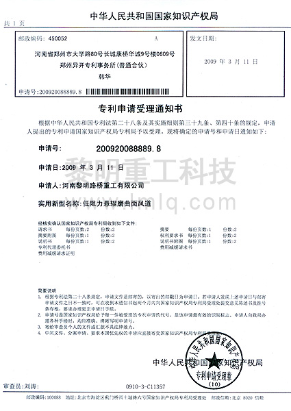 • 低阻力懸輥磨曲面風道專利號:200920088889.8 >>查看證書