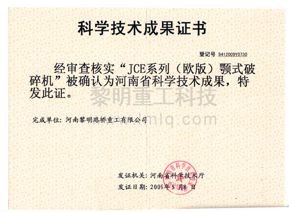 • JCE歐版顎式破碎機獲河南省科學技術成果 >>查看證書