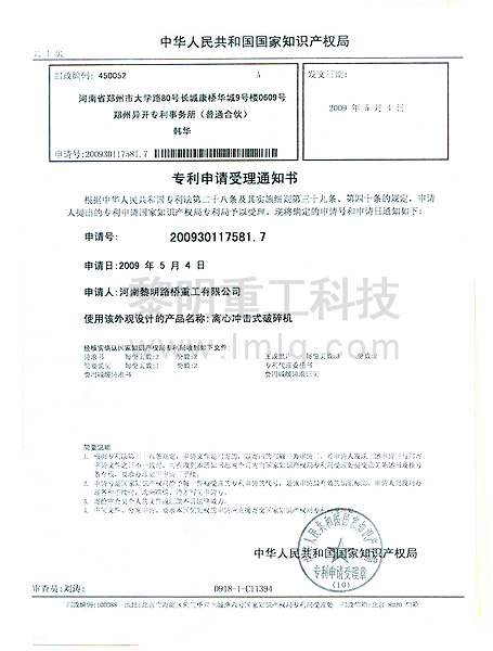 • 離心沖擊式破碎機 專利號:200930117581.7 >>查看證書