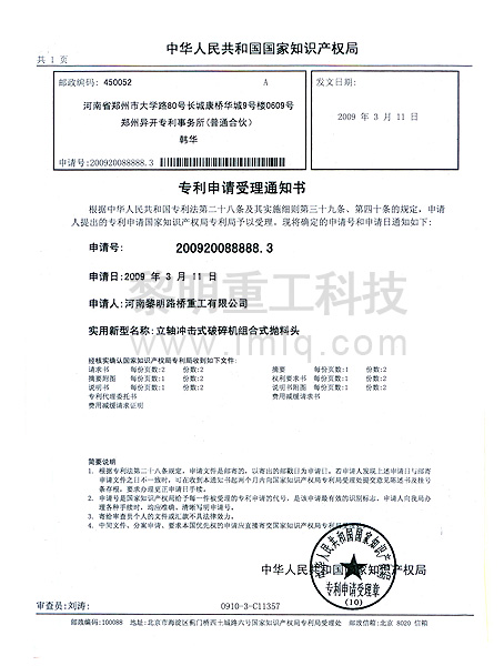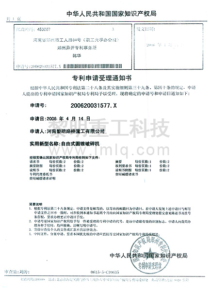• 自由式圓錐破碎機 專利號:ZL 200620031577.X >>查看證書