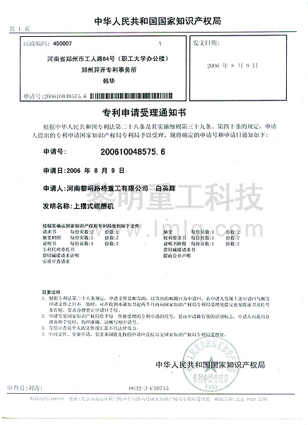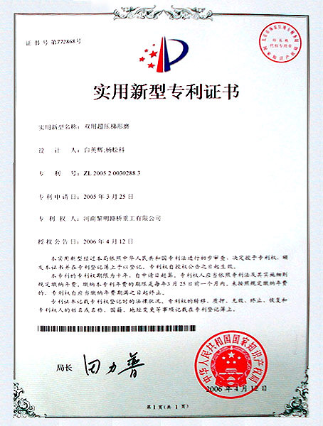 • 超壓梯形磨粉機專利號:ZL 200520030288.3 >>查看證書