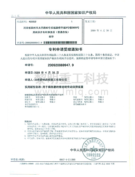 • 用于梯形磨的錐齒輪轉動潤滑裝置專利號:200920089947.9 >>查看證書