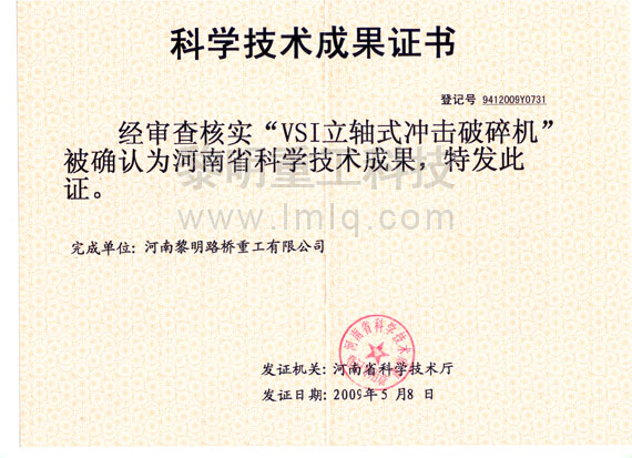 • VSI立軸式沖擊破碎機獲河南省科學技術成果 >>查看證書