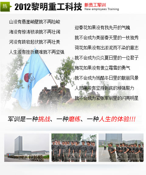 黎明重工科技自2004年啟動大學生員工計劃以來,軍訓拓訓已成為每一位新員工入職的必經之路。百余位職場新人朝夕相對,統一的作息時間,近似嚴苛的軍訓項目,蘊藏深意的拓訓內容。流火的七月,肆意揮灑的汗水,熱情洋溢的青春,2012屆新進職員,即將在這里開啟人生新的篇章。