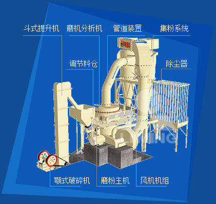 大塊非金屬礦經(jīng)顎式破碎機(jī)破碎后,由斗式提升機(jī)送至儲(chǔ)料倉(cāng),通過電磁振動(dòng)給料機(jī)均勻連續(xù)地送入磨粉機(jī)主機(jī)內(nèi)研磨,研磨后的粉末在鼓風(fēng)機(jī)的作用下吹向選粉機(jī)進(jìn)行分選。符合細(xì)度的非金屬礦粉由管道輸送到儲(chǔ)料倉(cāng);不合格的粒子重回磨粉機(jī)內(nèi)研磨。整個(gè)系統(tǒng)在負(fù)壓狀態(tài)下運(yùn)行,粉塵不外溢,從而保護(hù)了周邊環(huán)境。若經(jīng)脈沖除塵器過濾,環(huán)保效果更佳。