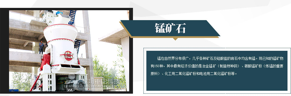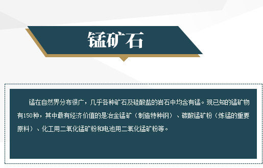 錳在自然界分布很廣,幾乎各種礦石及硅酸鹽的巖石中均含有錳。現已知的錳礦物有150種,其中有經濟價值的是冶金錳礦(制造特種鋼)、碳酸錳礦粉(煉錳的重要原料)、化工用二氧化錳礦粉和電池用二氧化錳礦粉等。