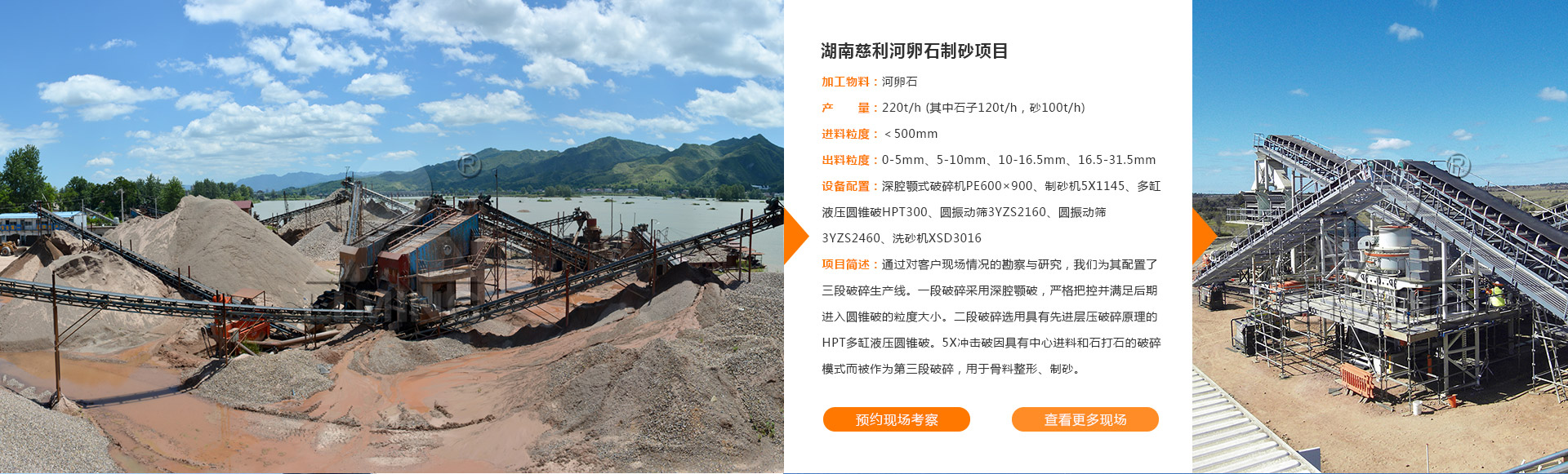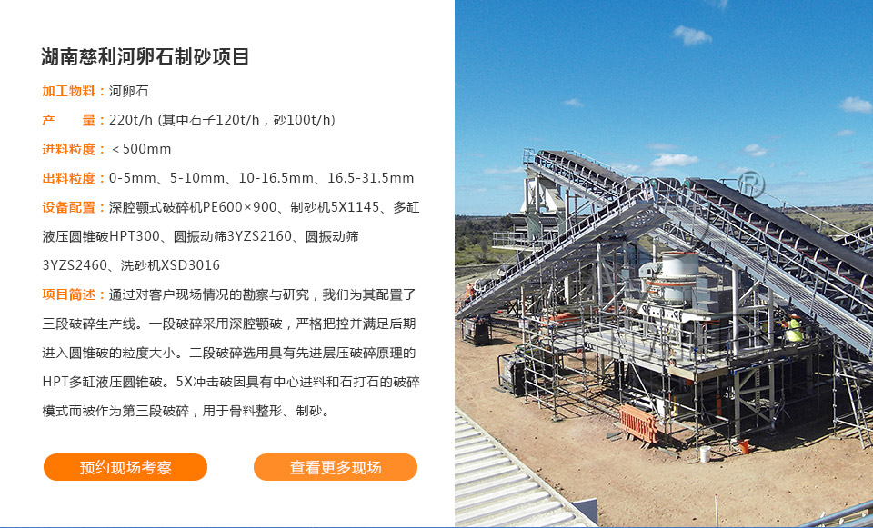 項目描述 :  通過對客戶現場情況的勘察與研究,我們為其配置了三段破碎生產線。一段破碎采用深腔顎破,嚴格把控并滿足后期進入圓錐破的粒度大小。二段破碎選用具有層壓破碎原理的HPT多缸液壓圓錐破。5X沖擊破因具有中心進料和石打石的破碎模式而被作為第三段破碎,用于骨料整形、制砂。