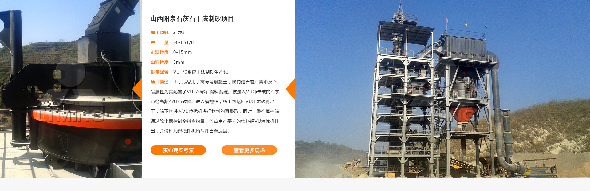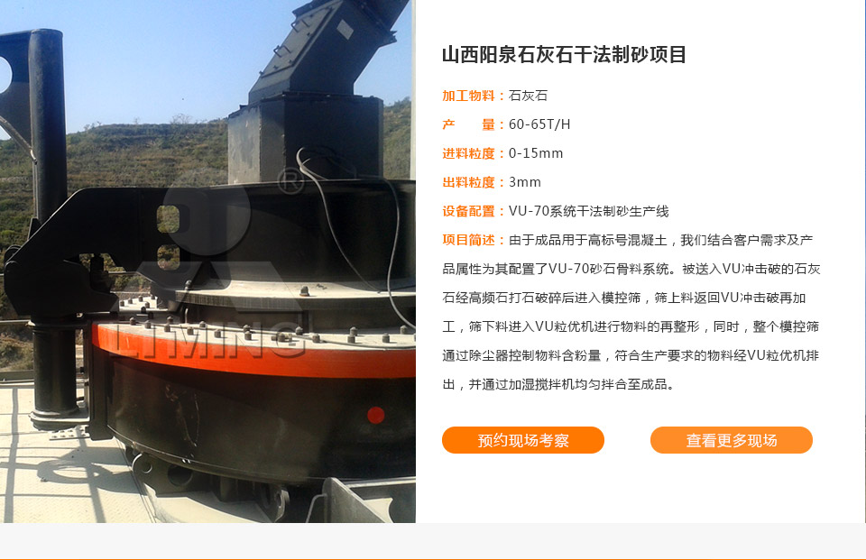 項目描述 :  由于成品用于高標號混凝土,我們結合客戶需求及產品屬性為其配置了VU-70砂石骨料系統。被送入VU沖擊破的石灰石經高頻石打石破碎后進入模控篩,篩上料返回VU沖擊破再加工,篩下料進入VU粒優機進行物料的再整形,同時,整個模控篩通過除塵器控制物料含粉量,符合生產要求的物料經VU粒優機排出,并通過加濕攪拌機均勻拌合至成品。